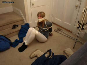 Pantyhose-clad Angelique Kithos scoots down the stairs looking for an avenue of escape!