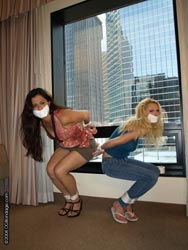 Miss Pandora and Dixie Comet are tied face-to-face and belly-to-belly in their underwear. Lots of ballgagged talking, ballgagged giggling, ballgagged laughing and even a little ballgagged kissing! Lots of light-hearted, silly, sexy bondage fun!